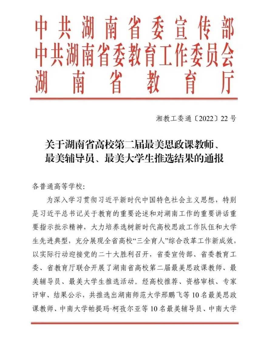 10月8日,“关于湖南省高校第二届最美思政课教师、最美辅导员、最美老员工推选结果的通报”公布,公司19级机自三班李宇曦同学获湖南省“最美老员工”称号,为公司获得此项荣誉的第一人。 (责编/王荣荣 初审/徐湛 终审/胡文静)