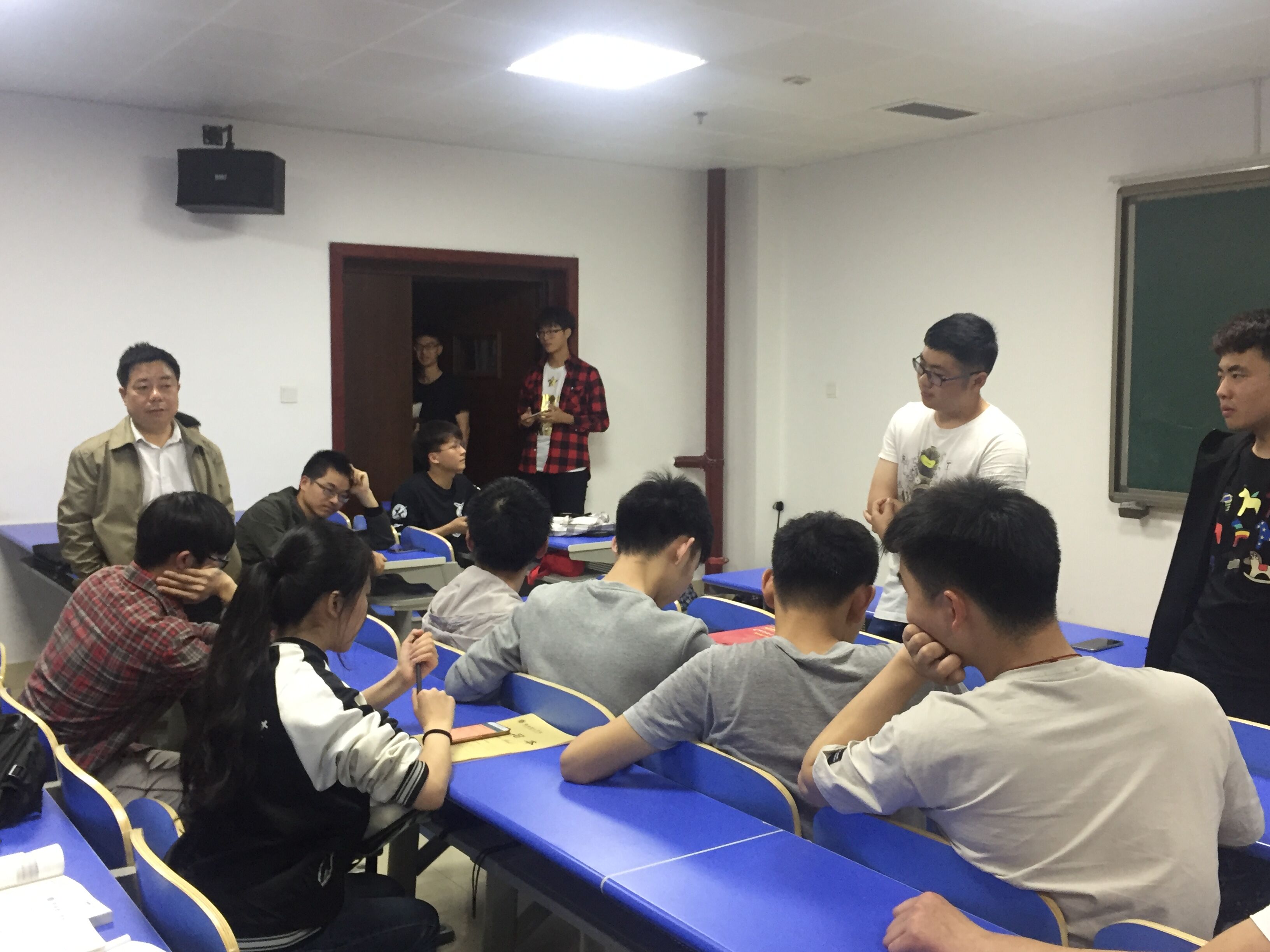 基于2014级考研经验分享交流会第一场在15级机自专业同学中获得一致好评,交流会第二场于4月12日19:00在12309如期举行,参与此次交流会的有公司党总支书记陈积光、15级辅导员李紫薇、14级机电班员工刘雄(广东工业大学)、付思(深圳大学)、胡锦(长沙理工大学)、周煌(浙江理工大学)以及15级部分有考研意向的同学。